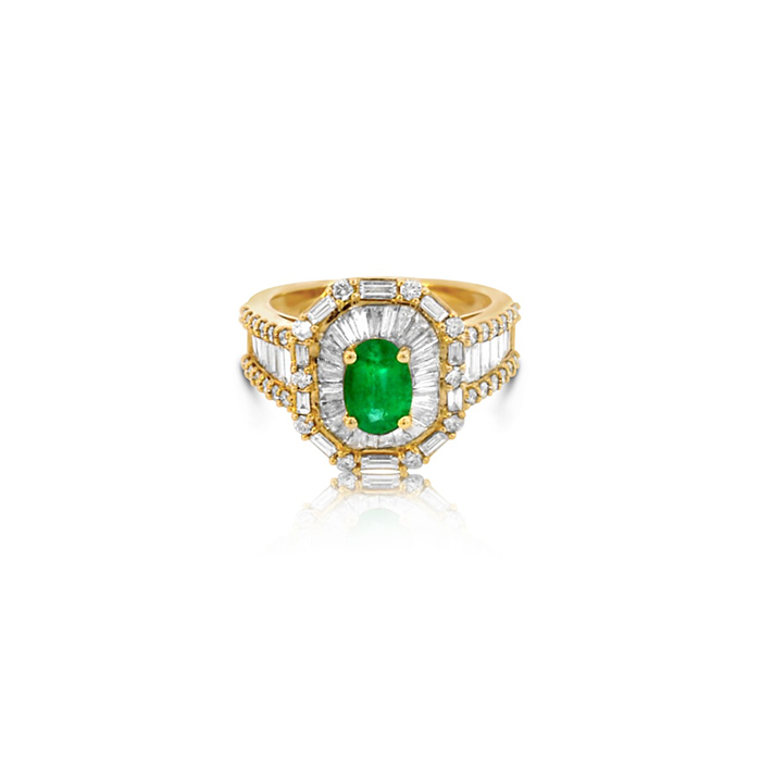18ct Yellow Gold Claw Set Oval Emerald & Diamond Bayede Ring